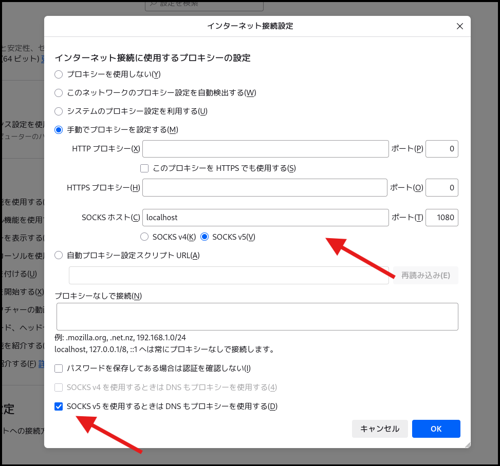 このとき SOCKS v5 を選択し、 SOCKS v5 を使用するときはDNSもプロキシーを使用する にチェックを入れてください。