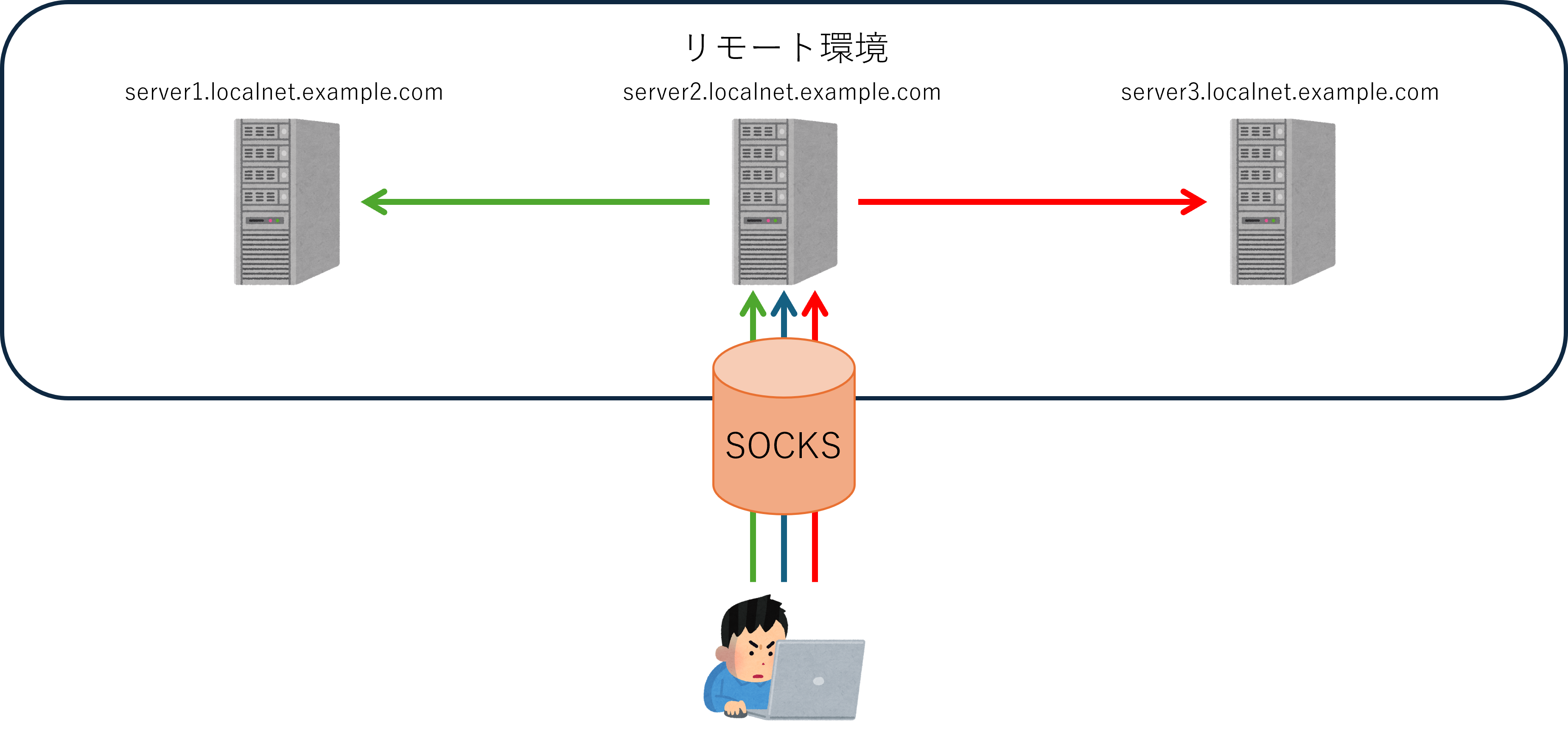 SOCKSプロキシを経由することで、リモート環境内への通信が可能になります。