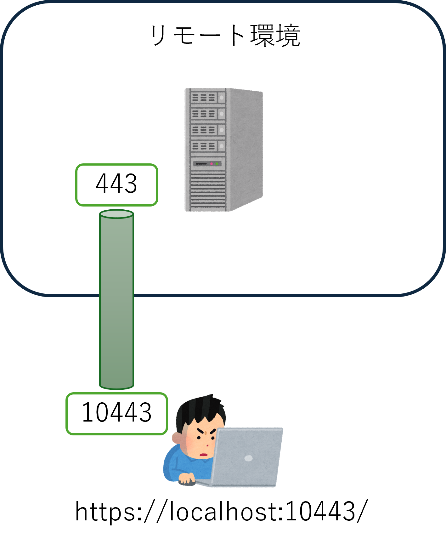 以下のコマンドでリモートサーバーの443ポートをローカルの10443ポートに転送出来ます。