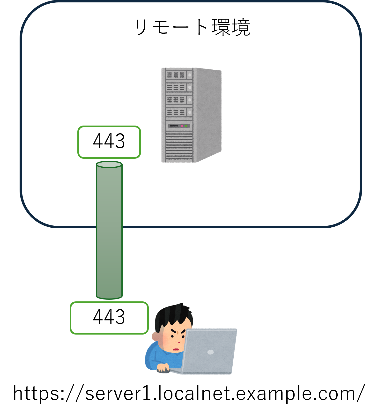 これで443ポートでポート転送が利用可能になりました。 以下のコマンドを実行することでリモートサーバーの443ポートをローカルの443ポートに転送出来ます。