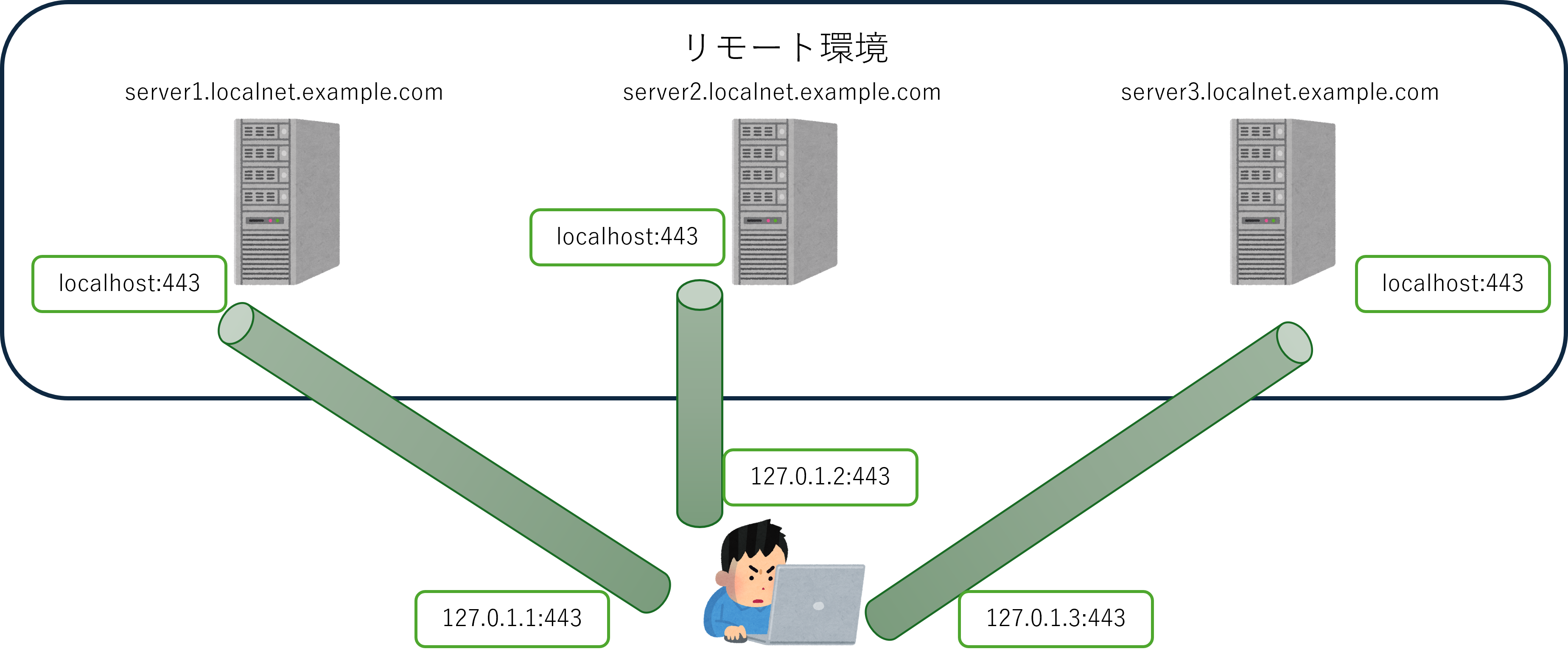 server2.localnet.example.comなど)に対して、sshポート転送を設定する /etc/hostsを書き換える